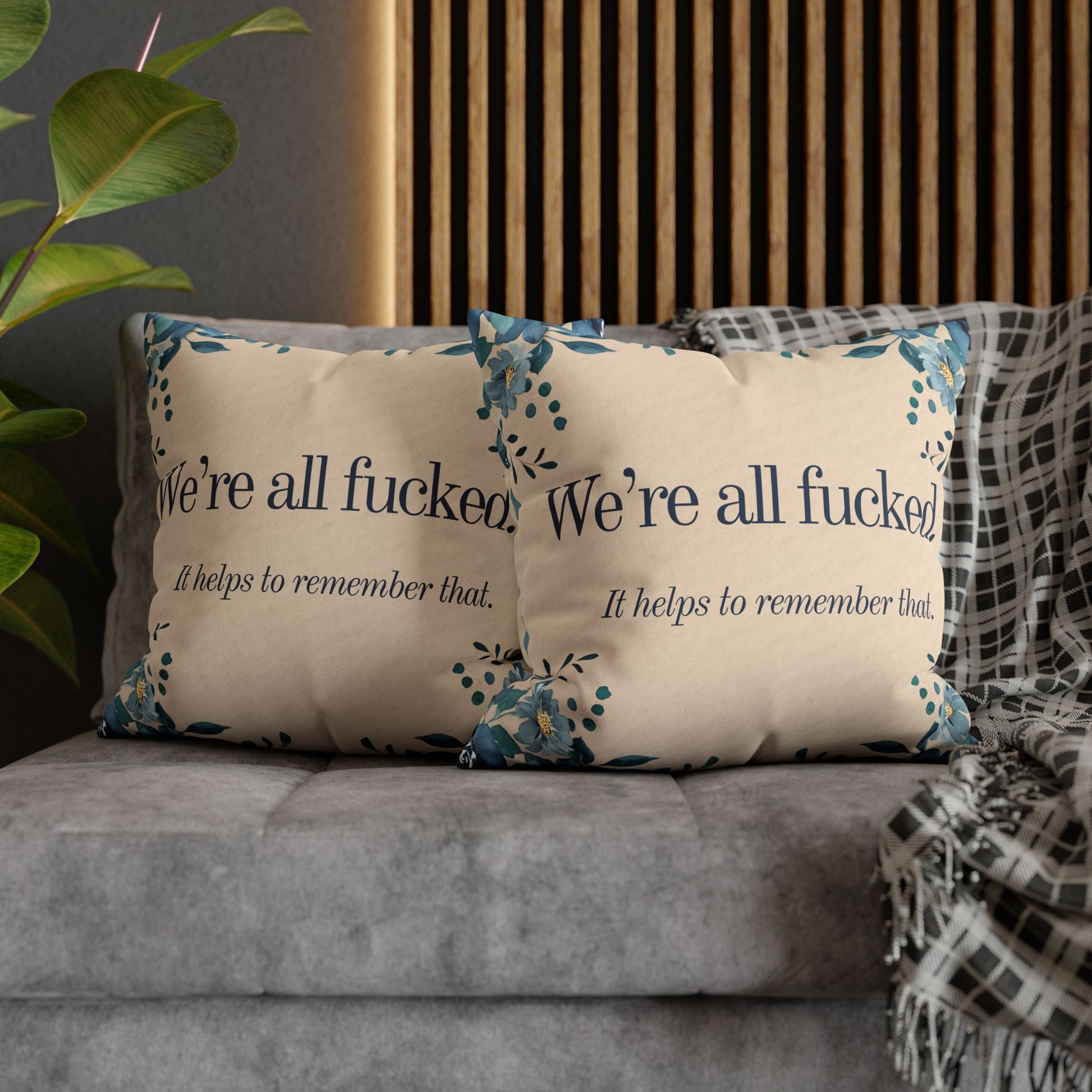 This soft decorative throw pillow features a muted floral frame and a quietly honest message: We’re all fucked. It helps to remember that. Equal parts comfort and catharsis, it’s designed for people who cope with life using humor, honesty, and good interior lighting.